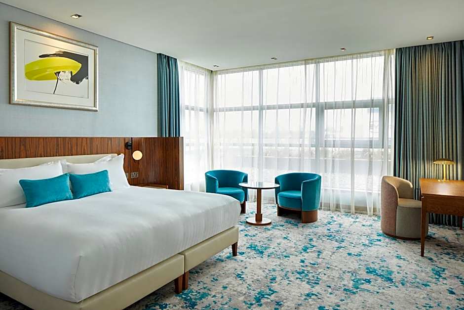 With a retail park view or internal courtyard view, this room allows for extra bed if required. There is a very spacious bathroom with large walk-in shower, a free standing bath and double sinks. There is also a living room with a flat-screen TV.